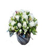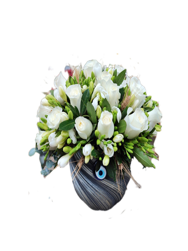 SERAMİK VAZO İCİNDE 30 ADET BEYAZ GÜL ARANJMANI BEYAZ FREZYA İLE HAZIRLANAN ÜRÜNÜMÜZ