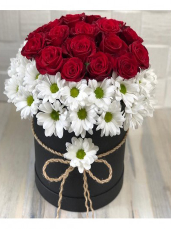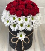 silindir siyah kutu içinde beyaz papatyalar ve 20 adet kırmızı gül ile hazırlanmış ürünümüz sevgiliye en güzel hediye