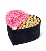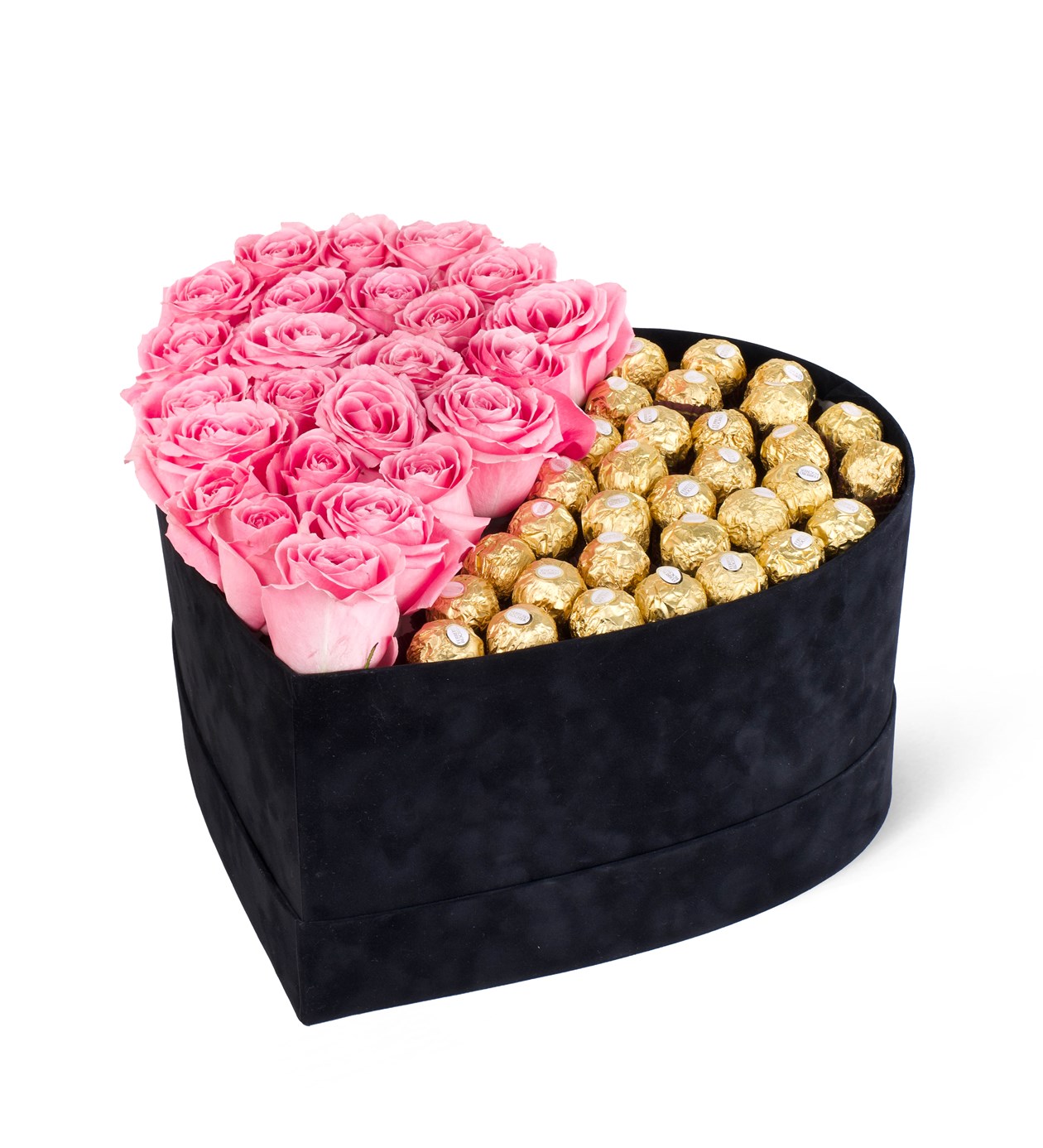 kadife Kalp Kutuda Çikolatalı Pembe Gül