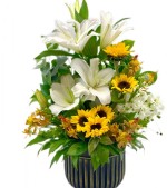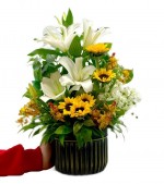Özel alt yapımız antik saksıda lilyum ve ayçiçeği aranjmanımız sizler için özenle hazırlandı. Ekstra bir bakım gerektirmez. Antik alt yapı ölçüleri 15 x 20 Ürün toplam yüksekliği 45-50 cm