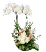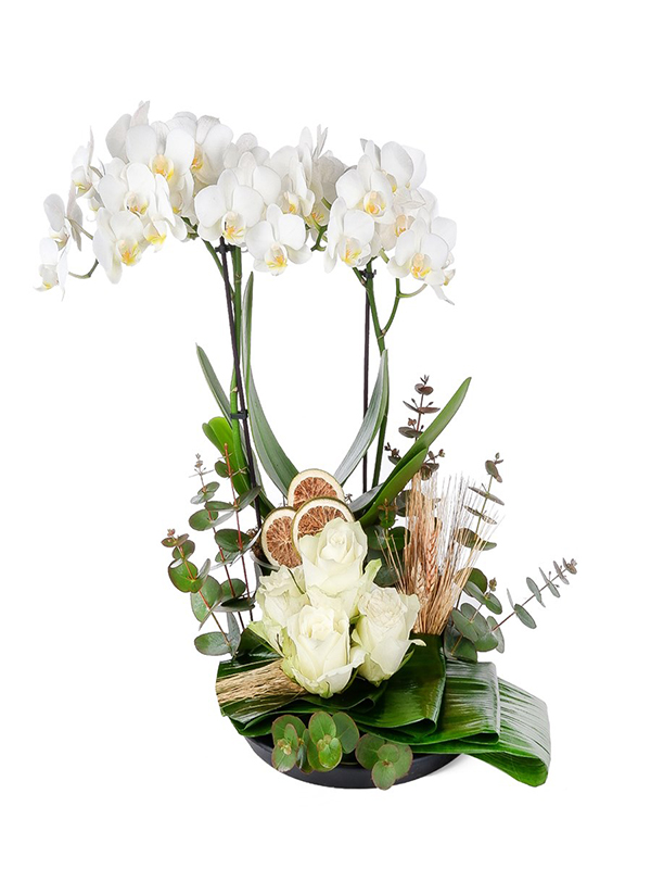 beyaz midi orkide 4 adet beyaz gul yesıl yapraklar ve kuru başak dalları ıle hazırlanan ürünümüz