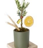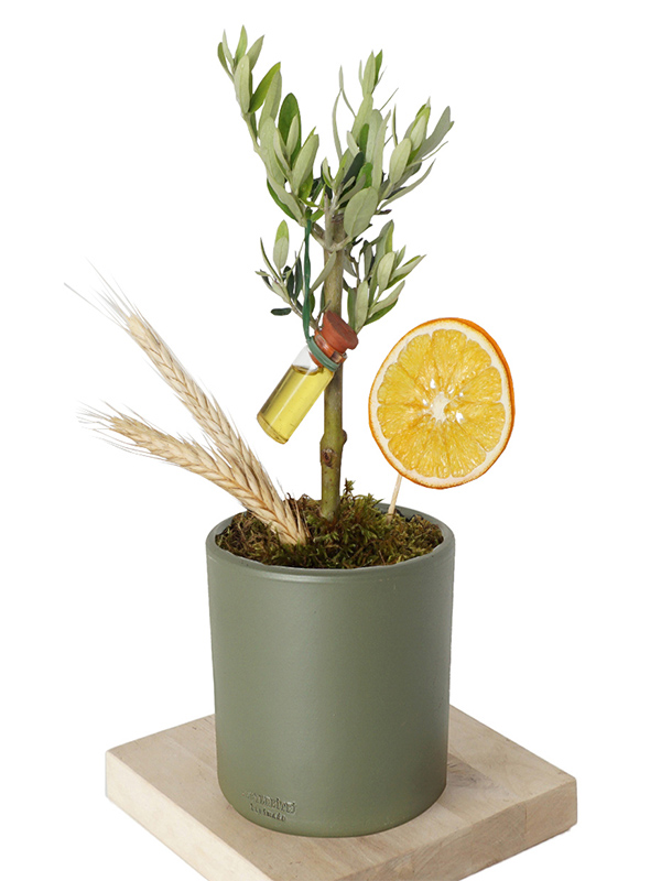 Zeytin ağacının kökeni Akdeniz'dir. Dostluk ve huzurun sembolü olarak bilinir. Direkt gün ışığı alan alanlarda hızlı büyür ancak yapraklarının güneşin en yoğun olduğu saatlerde yanmaması için gölge konumu tercih edilir. Daha düzenli uzaması ve şeklini koruması için yaz ve ilkbahar aylarında budayarak büyümesini kontrol edebilirsiniz. Zeytin ağacı aranjmanımız, gerçek buğday ve kurutulmuş portakallar ile senin için hazırlandı.